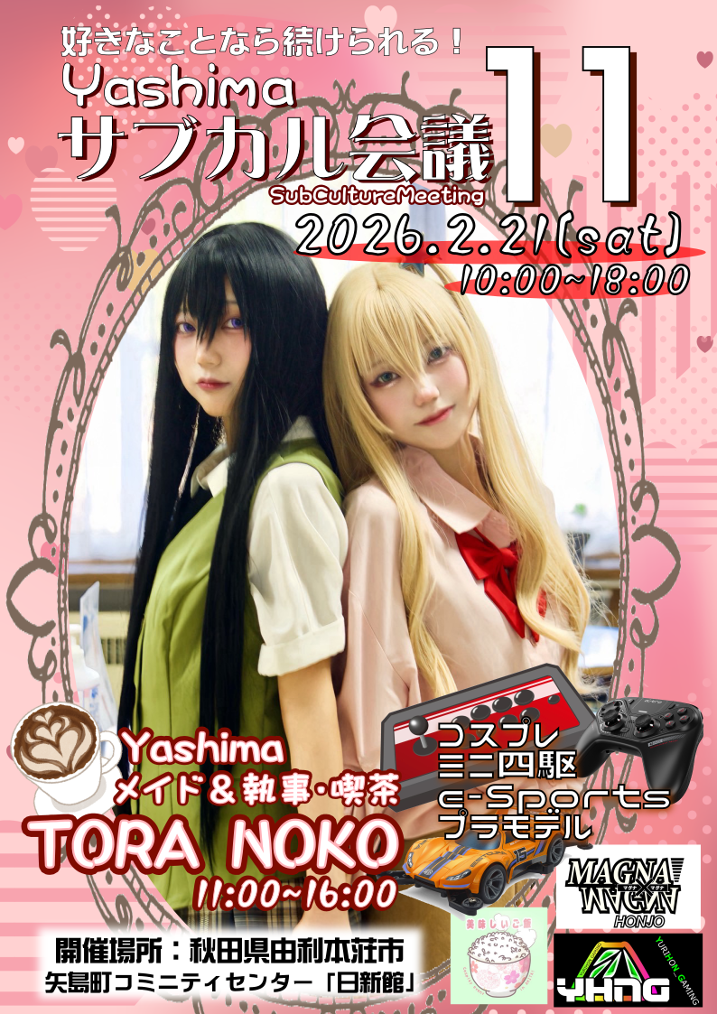 内容 Yashimaメイド&執事カフェ、コスプレ、ミニ四駆、e-スポーツ、プラモデルなど