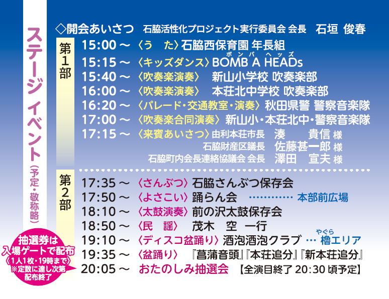 また、「石脇さんぶつ」といった地域に伝わる伝統芸能や民謡ショー、おたのしみ抽選会もありますので、