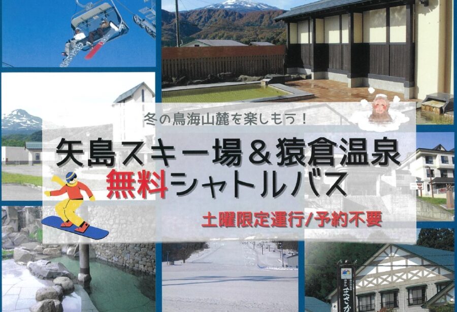 今年も矢島駅から矢島スキー場と猿倉温泉郷を巡るシャトルバスを運行します! 無料シャトルバスで、冬の鳥海山のスノーアクティビティや天然温泉...